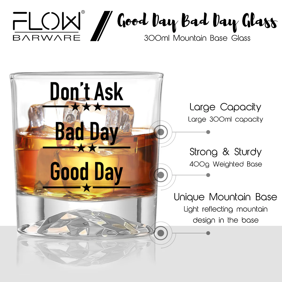 With a heavy weighted base and delicate sipping rim this stylish Novelty Whiskey Glass Tumbler is perfect for Whiskey, rum or any liquor. Featuring the slogan Good Day, Bad Day, Don’t Ask it comes complete with a gift tube and so it is ready to wrap for those all-important occasions....Father's Day, Birthdays & Anniversaries