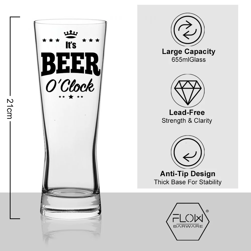 This Contemporary It's Beer O'Clock Pint Glass is the only way to serve your beer and a fabulous gift idea for any beer Lover. Printed with the fun slogan It’s Beer O’Clock this crystal clear, slender pint glass is perfect for enjoying a long cold beer at Beer O’Clock.